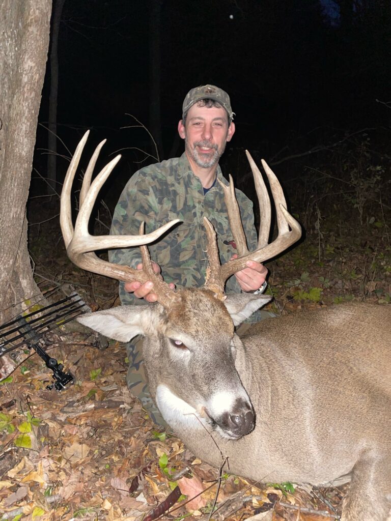 While pulling a card on a camera and sitting on a steep bank to view the pictures, we noticed the area had a lot of nice bucks roaming through it. Then we heard some commotion on top of the hill and looked up to see a good-sized cedar tree moving back and forth. A buck was tearing it apart. Then, he walked right down the hill to us and the arrow was through it like a hot knife going through butter. Seconds later, we were standing over a giant. The buck scored 180 2/8. I’d say it won’t lose a whole lot in the drying period and should end up just a tad under that. What a day. Go Tar Heels!!! Although it’s usually the Orange Army that takes down the big bucks we’ll stick with college references and say the Orangemen took down the big buck. Go Orange!!